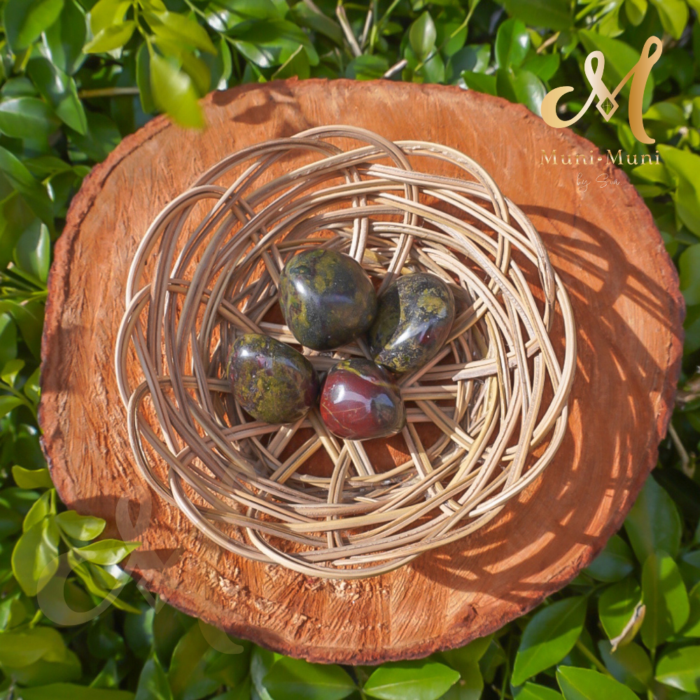 DRAGON’S BLOOD JASPER: Strengthens courage and resilience. Green is epidote; red is iron-rich minerals.